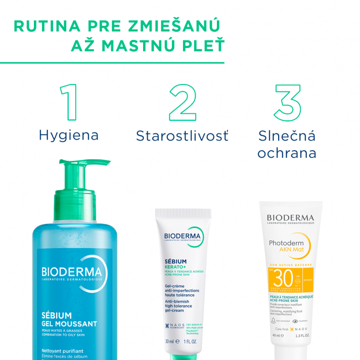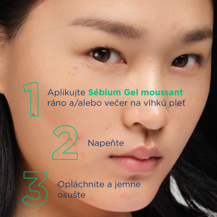 Sébium Gel moussant jemne čistí a purifikuje pokožku, nevysúša ju: obsahuje síran zinočnatý a síran medi. Čistí epidermu, znižuje počet nedokonalostí a obmedzuje tvorbu mazu. Jeho ultra jemné zloženie bez obsahu mydla nenarušuje rovnováhu pleti: fyziologické pH zostáva nemenné. Patentovaný komplex účinných látok zvyšuje prah tolerancie pokožky.