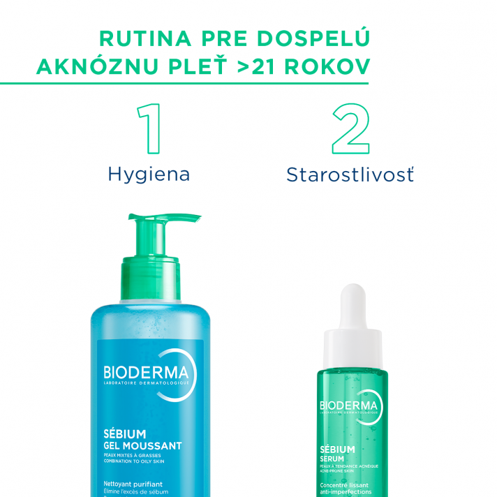 Výskum laboratórií Bioderma založený na princípe ekobiológie vyvinul Sébium Sérum, koncentrované sérum proti nedokonalostiam a na zjemnenie prvých známok starnutia. Doplnkové pôsobenie presne dávkovaných účinných látok (kyselina salicylová, acetyl glukosamín, kyselina hyalurónová) a technológia FLUIDACTIV™ pôsobia okamžite na prejavy aknóznej pokožky dospelých.