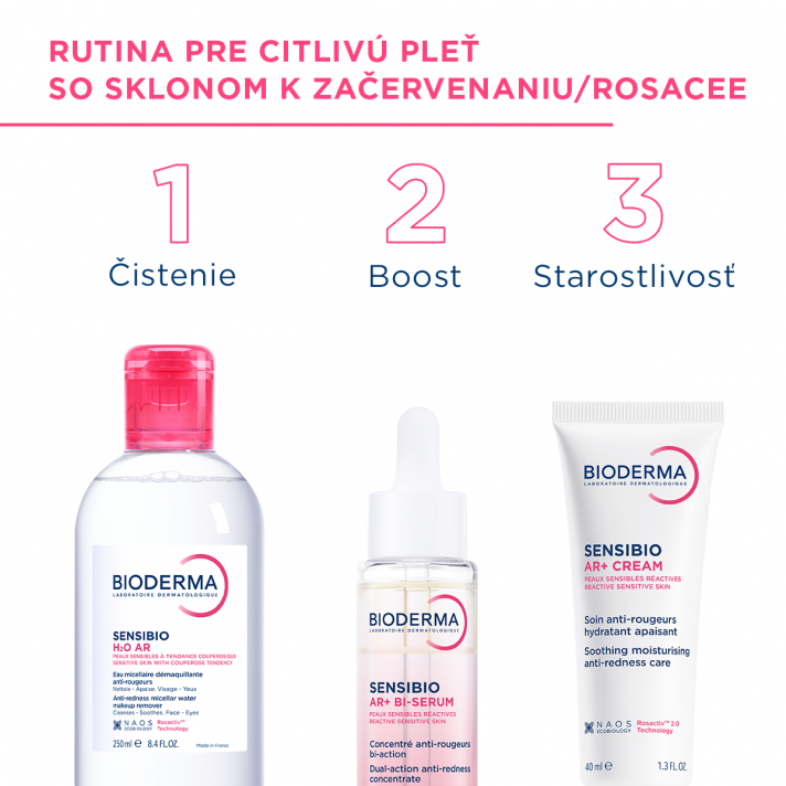 Sensibio H2O AR je 1. micelárna voda na odstraňovanie make-upu, ktorá napodobňuje prirodzené zloženie pokožky – zaisťuje tak dokonalé odstránenie make-upu a plne rešpektuje požiadavky aj najcitlivejšej pleti. Napomáha redukovať začervenanie, biologickou reguláciou faktora zodpovedného za vazodilatáciu.